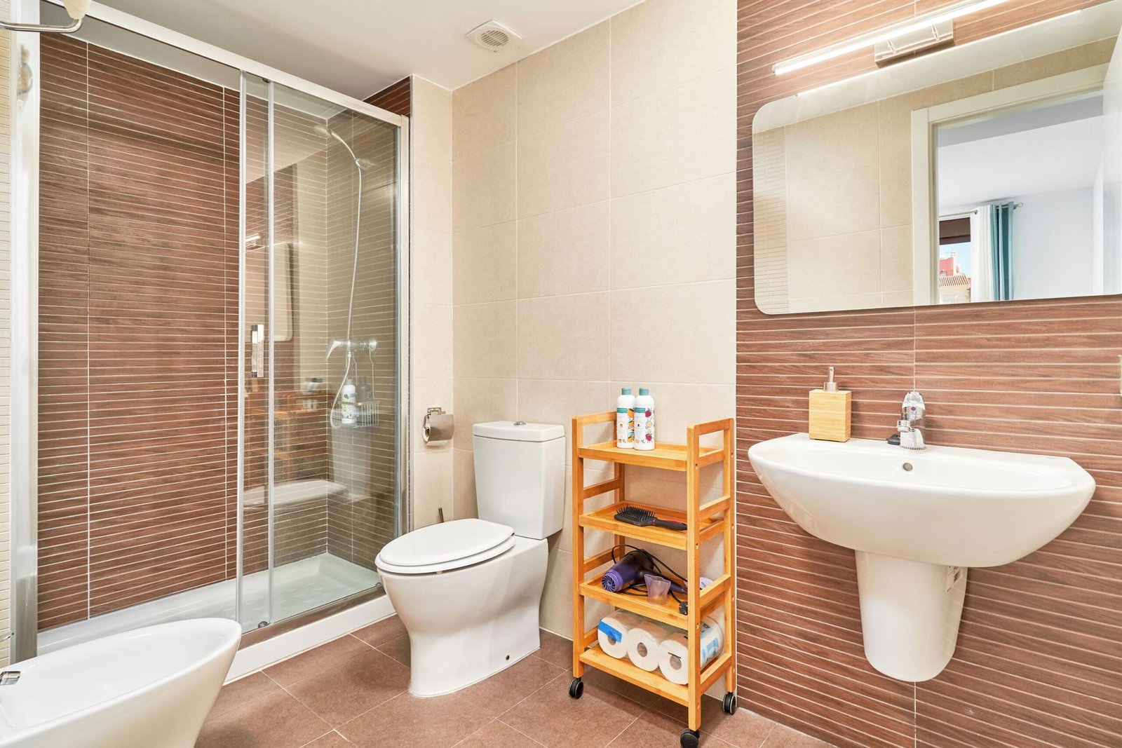 Additional amenities include Wi-Fi, a 50-inch Smart TV, ducted air conditioning, and a cot available. The communal areas offer a children’s pool and a pool with waterfall. The location is very convenient, close to the old town, town hall, health center, shops, and restaurants. The beaches are just 1 km away. Free parking is available nearby. Pets and smoking are not allowed on the property. The building is equipped with security cameras and/or audio recording devices, as well as an elevator. Easy access to the highway.